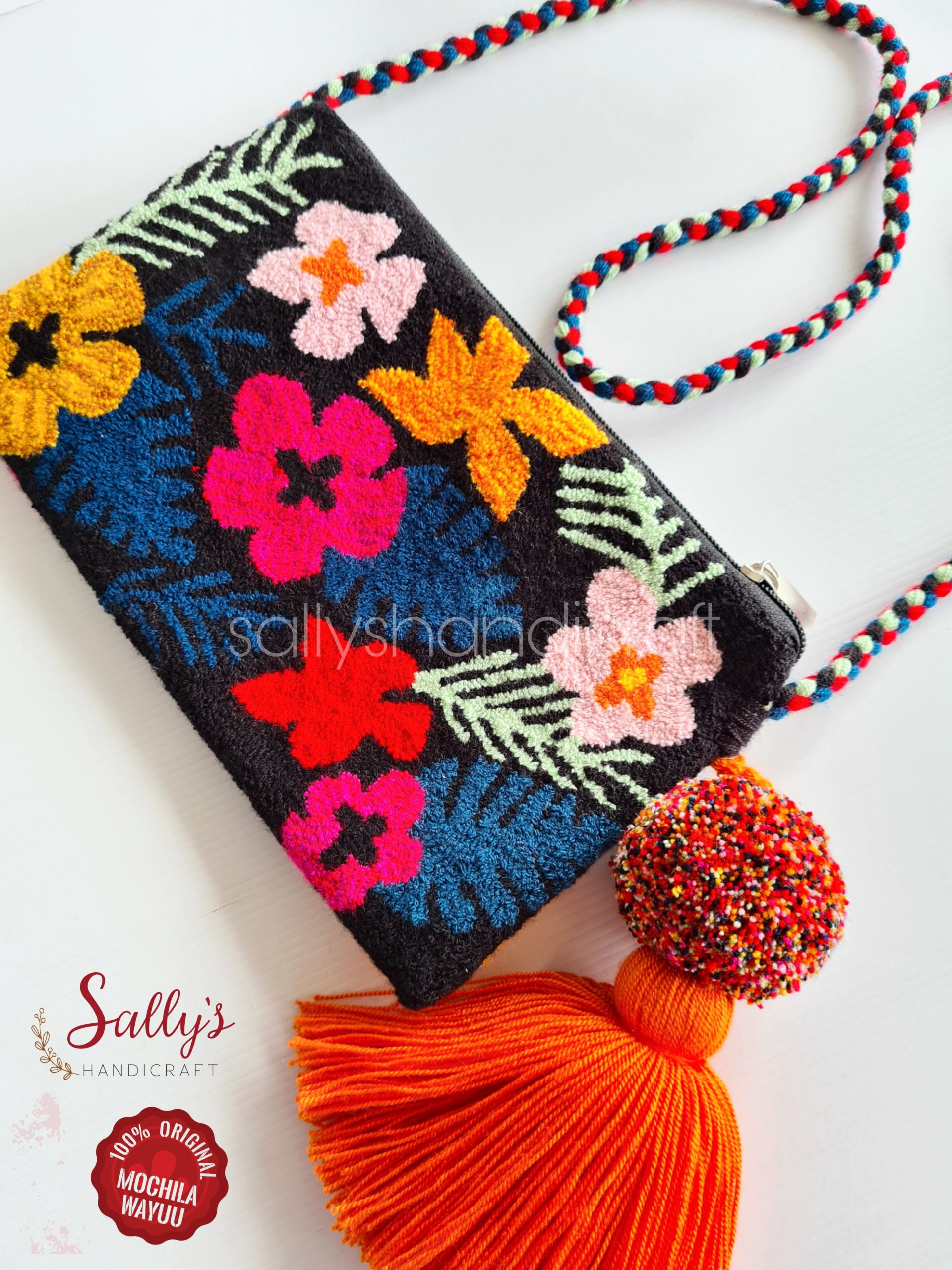 Technique: A Handmade embroidered clutch lightweight. Bag come with large zipper and decorate with pompom