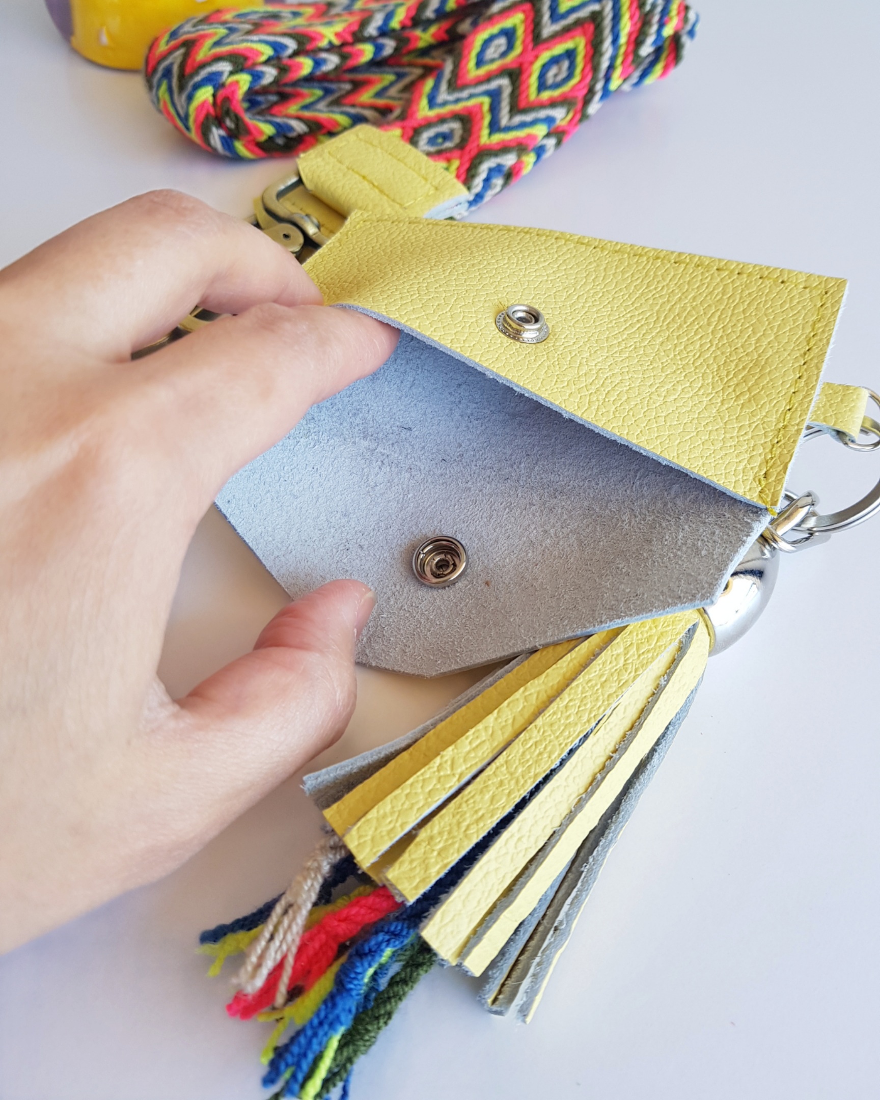 100% Genuine leather coin purse with button closure, decorated with threads and leather tassels.