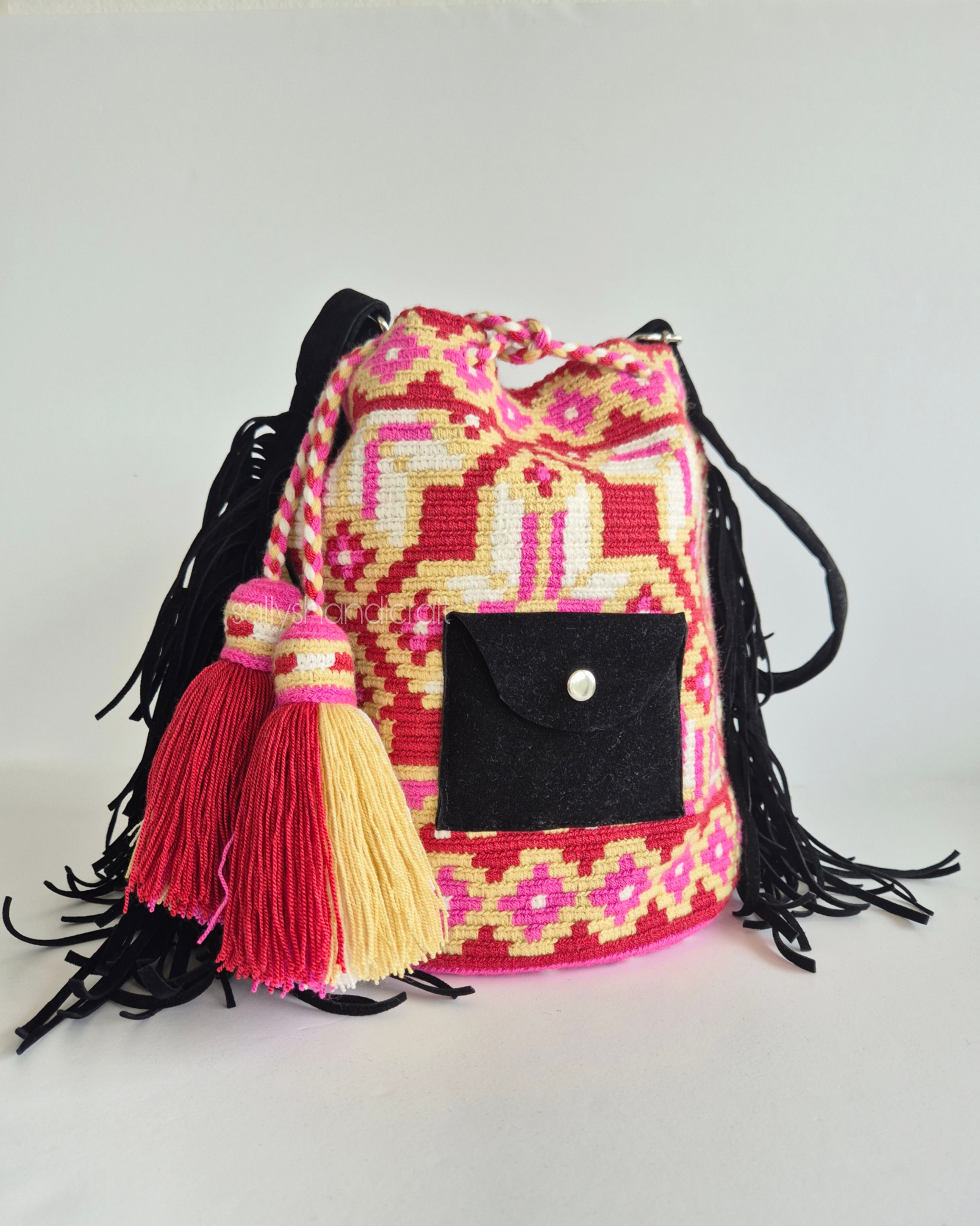 This bag is handcrafted by Wayuu artisans from Colombia and thoughtfully designed by Sally’s Handicraft. It is a limited-edition design exclusive to Sally’s Handicraft, embodying a unique blend of craftsmanship and the rich cultural heritage of the Wayuu community. The bag features a fun design with bohemian accents, crafted from genuine leather. The interior is fabric-lined and includes a convenient pocket and it has a small pocket on the front.